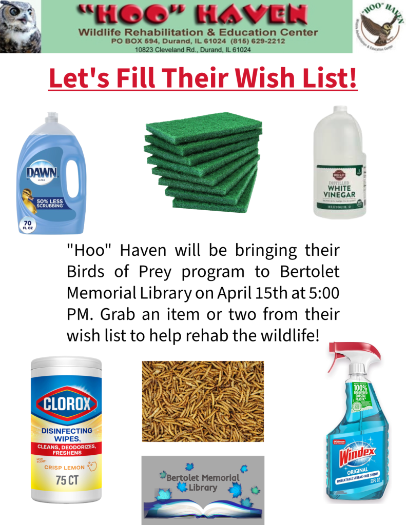 We are collecting items from the wish list for “Hoo” Haven. Check out the list and grab an item or two ahead of “Hoo” Haven’s visit on April 15th. They will be bringing their Birds of Prey program to Bertolet Memorial Library, and we want to show our support through filling their wish list needs. Drop off your donations today or bring them April 15th and stay for the program!